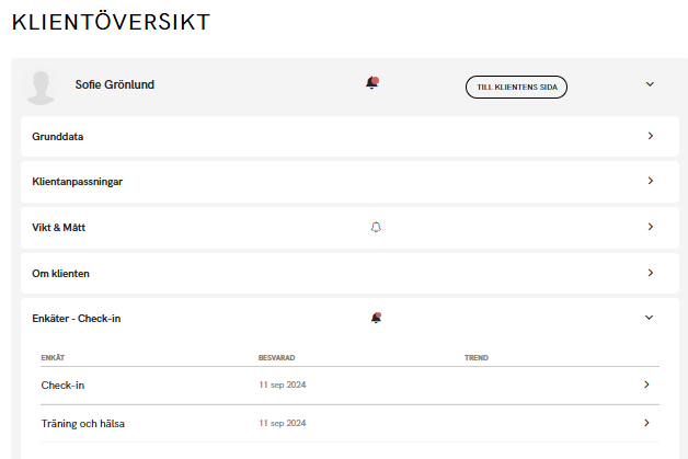 Du kan skapa enkäter och skicka till dina klienter för att få svar på frågor och följa upp hur det går för klienten.