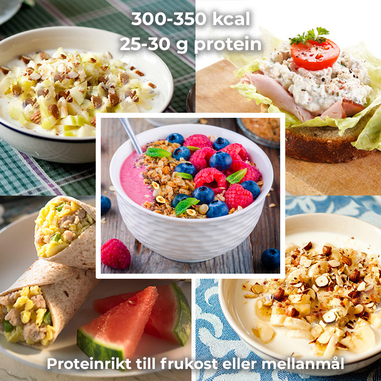Efter önskemål har vi lagt till 5 extra proteinrika frukostar (eller mellanmål) i vår receptsamling och i ett kostschema med frukostförslag. De innehåller 25-30 g protein och 300-350 kcal.