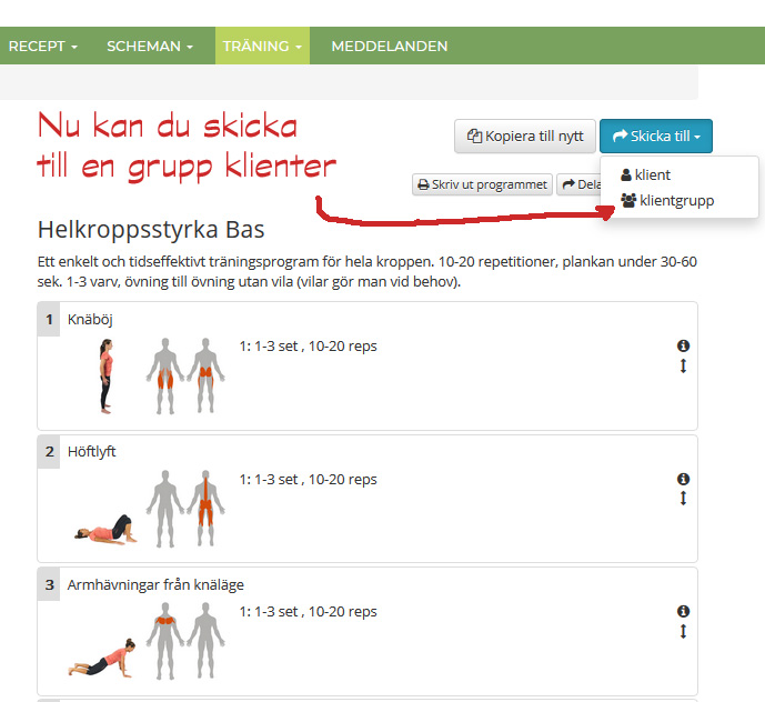 En efterlängtad nyhet är att man nu kan skicka ut måltidsscheman, träningsprogram och även skicka meddelanden till en grupp klienter. Den funktionen kommer väl till pass om man har företagkunder, viktminskningskurser, gympagäng eller andra grupper som man vill ge samma information.