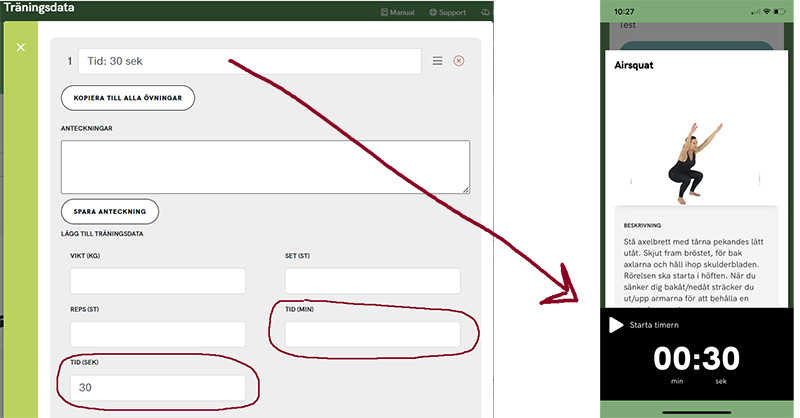 Klienten får en timer i appen när du fyller i tid (sekunder eller minuter) i övningens träningsdata.