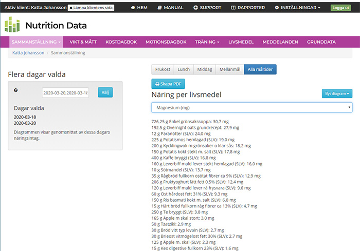 NYHET! Funktionen ”Näring per livsmedel” hjälper dig som är dietist eller kostrådgivare att analysera en kostregistrering och se varifrån näringen kommer. Man väljer det näringsämne man vill titta på och får då fram en lista på alla livsmedel klienten ätit sorterade så det som innehåller mest av näringsämnet ligger överst och minst längst ner.