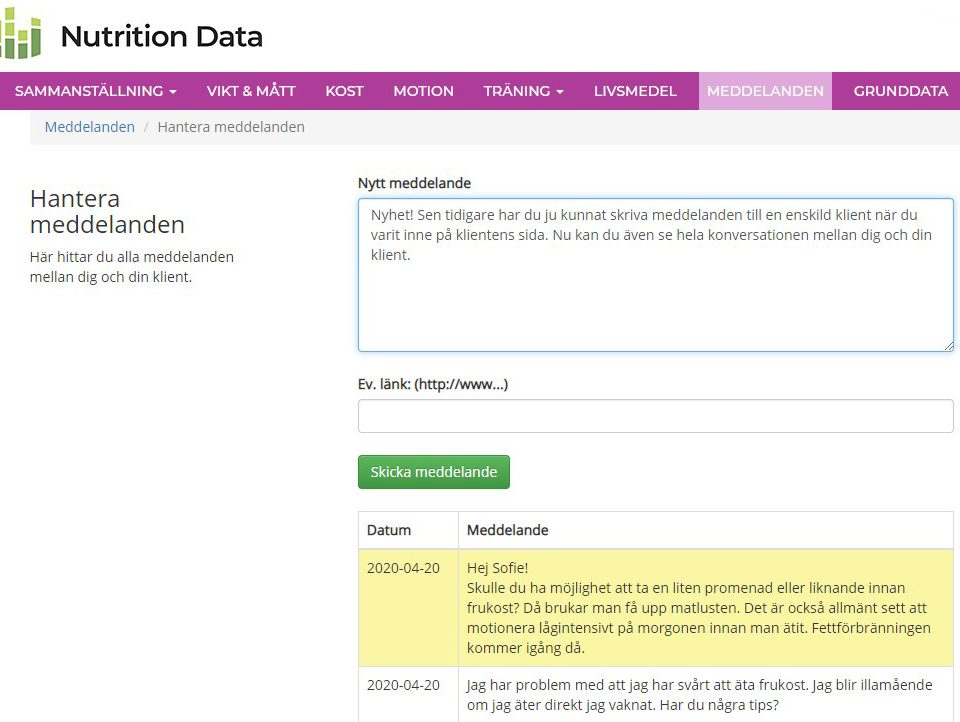 Sen tidigare har man som coach kunnat skriva meddelanden till en enskild klient när man varit inne på klientens sida. Från och med nu kan man även se hela konversationen mellan coach och klient.
