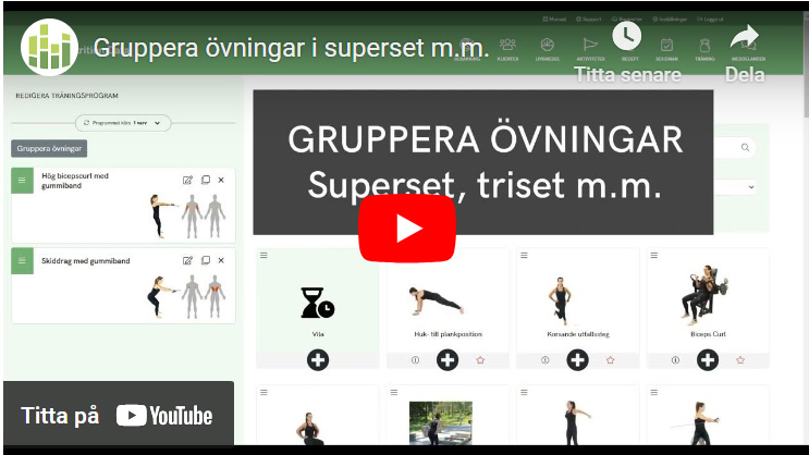 I samband med att du skapar ett träningsprogram så kan du nu gruppera övningarna i exempelvis superset eller triset. Anger du tid för vila eller övningar så får klienten en timer i appen.
