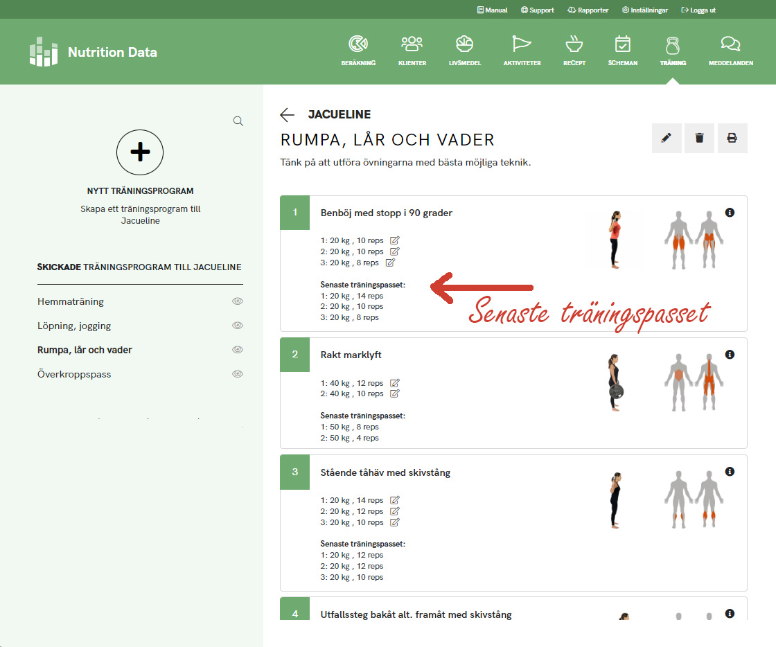 När du nu går in på de träningspass du skickat till en klient så ser du vad klienten registrerat för vikt/reps/tid för förra träningspasset. Det blir då enkelt för dig att vid behov justera dina rekommendationer.